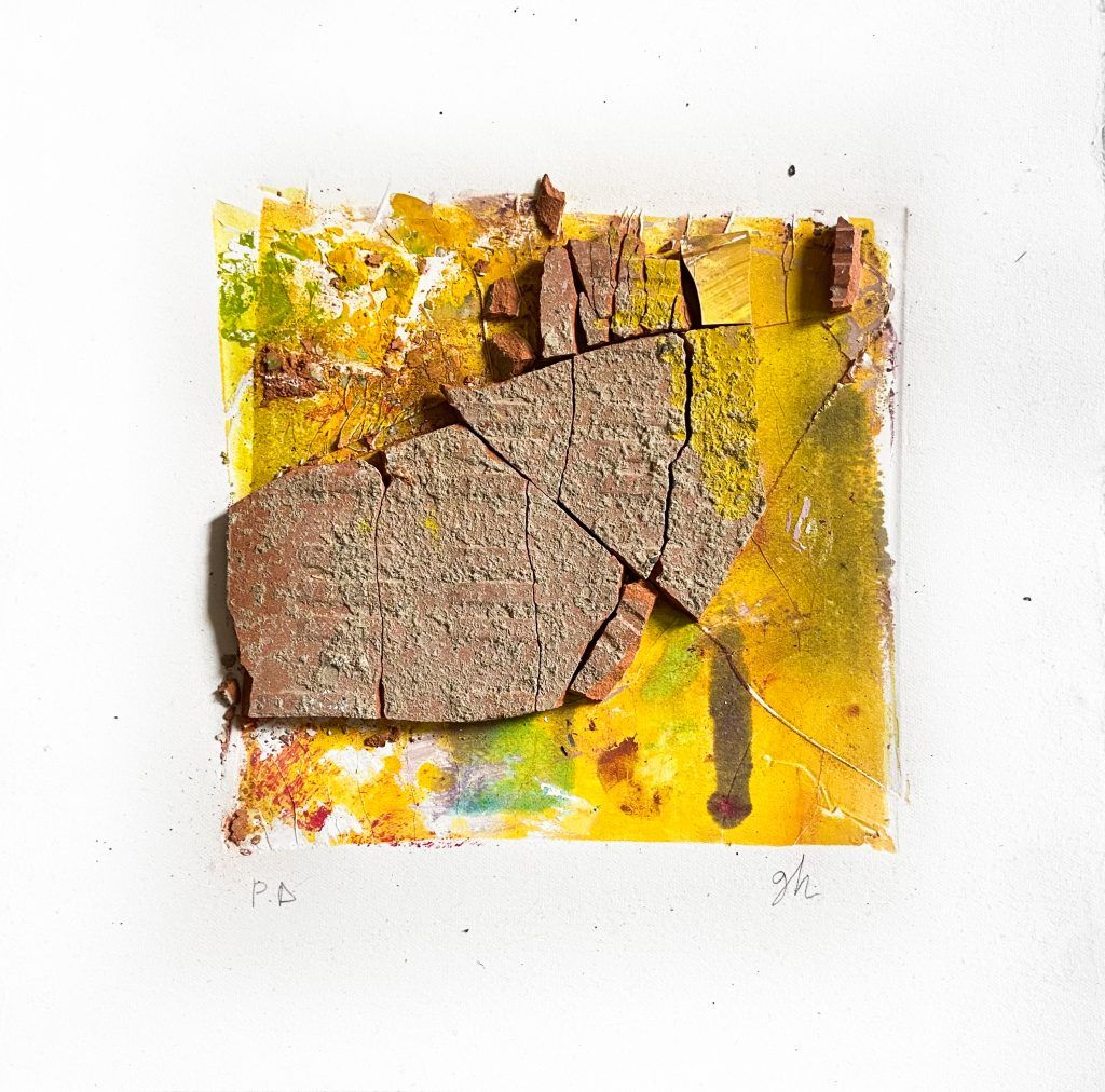 “Estampas del Duelo” es un viaje por la herida. Una travesía silenciosa a través del dolor, donde cada obra se convierte en el reflejo de lo que todos hemos sentido al perder. La estampa, con su capacidad de dejar huella, se transforma en piel que recuerda, en materia que siente. Cartones desgarrados, flores prensadas, vacíos que hablan. Elementos que transmiten, en su conjunto, transformación. Aquí, la negación, la ira, la tristeza y la aceptación no son conceptos, son texturas, formas y colores que vibran con la intensidad de lo vivido. Cada imagen es un recordatorio del acto valiente de sentir.
